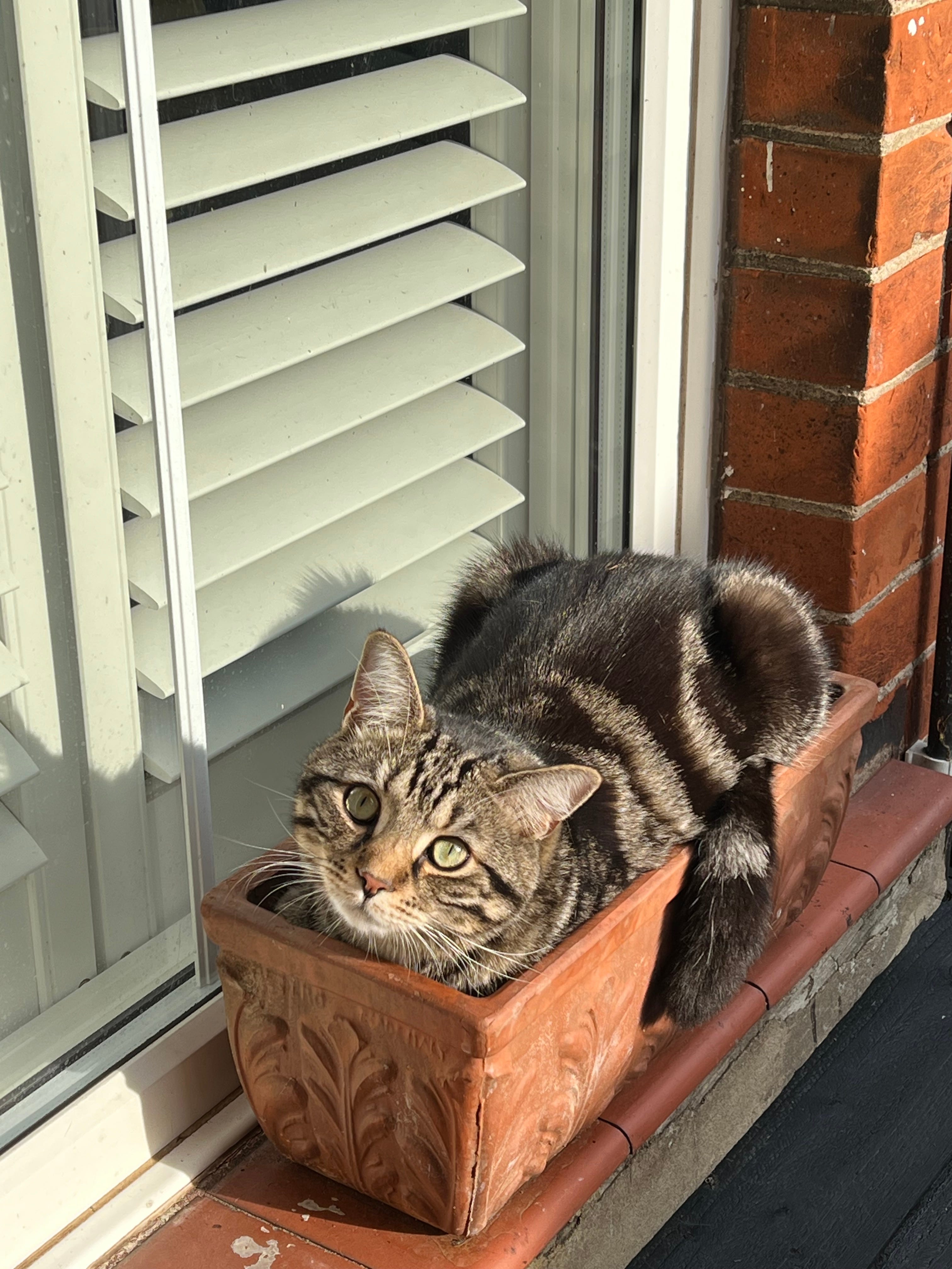 Behind the Out House there is only my new water butt, which the newly installed gutters drain into. I want to get a compost bin. I need to plant out the pots and hanging baskets over the next month or so. Another job on my list is to paint the planks on my bench. This was repaired for me so after I moved in but the paint on the new planks is coming off. I haven’t had this resprayed yet like the rest of the patio furniture. There an old fence panel I need to rid of. Basil likes sharpening his claws on it. The pallet from the bathroom sanitary ware is still littering the courtyard. Again this is being used as a scratching post. I have a large pot of Cat Nip on the window sill that I grow for Basil. He just tends to sit on it, like a loaf in a baking tin.