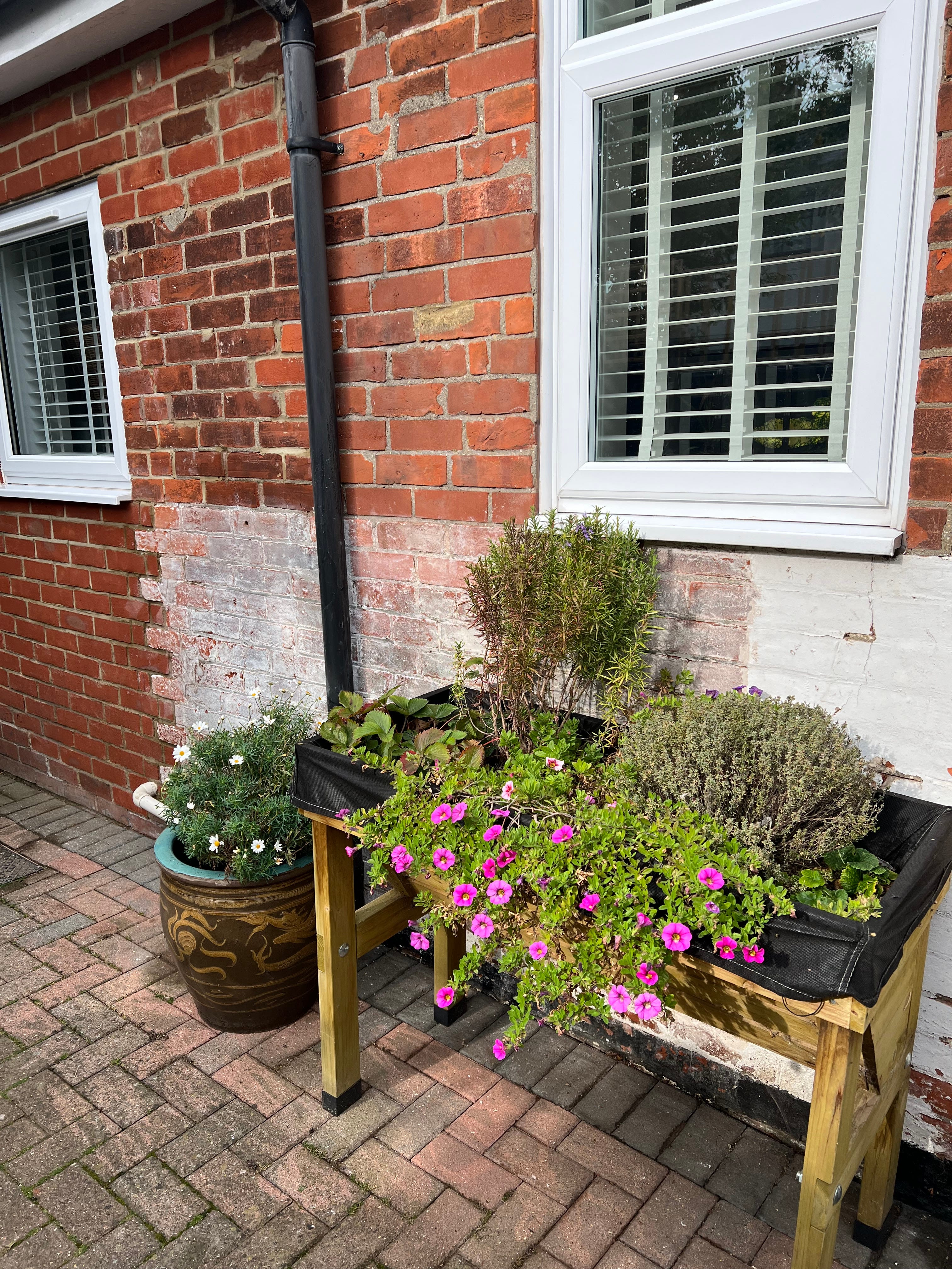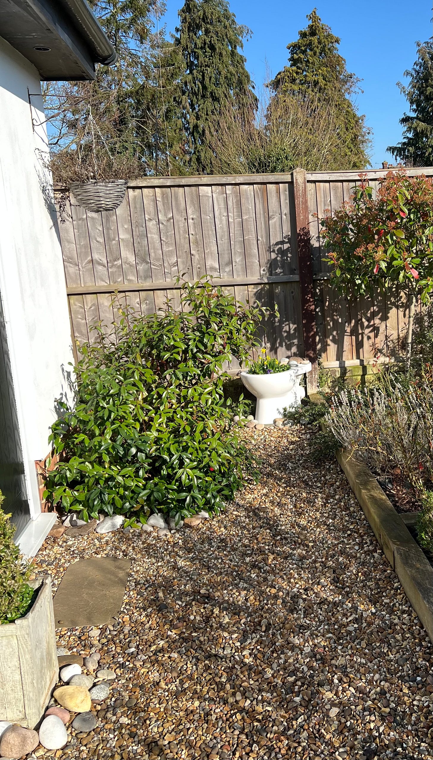 I recently planted out my old toilet in the dry garden. The dry garden was my big project last year and all the plants are thriving. I was a little unsure how well they would do, as I have no idea what the soils like under the weed membrane. The box plant in the planter is drying but it was only a cheap plant from B&M. Plants never do well in that planter. It’s too small. I’ve bought lots of pebbles for this area. I also keep picking them up places and bringing them home. I want some large ones. Ideally I’d like festoon lights for here as well. There’s some gorgeous scented Jasmine by the door into the Out House which needs a trellis. I also planted a large Wisteria. There another seating area here. There’s a large clump of bluebells which have escaped from next door which I am trying to encourage and lots of wild violas.