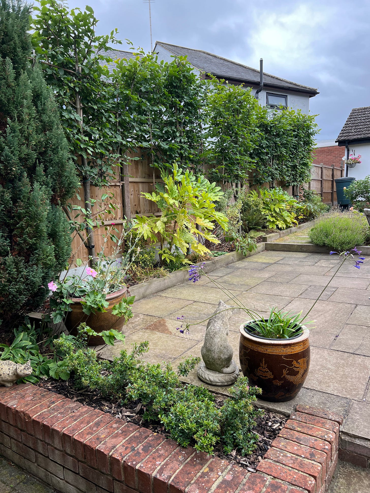 The patio is York stone. Some of the slabs are loose. It has boarders all round. This is where I have planted a lot of plants but there’s still plenty of gaps. I have planted some bulbs but I need to plant a lot more. There are two smaller pots with Agapanthus in them. The two bigger dragon pots still need planting. I still haven’t taken out the wooden table and chairs for here out of the garage. There’s a line of pleached beeches that go along the left hand fence. I’d like to plant some on the right hand side too but they are really expensive.