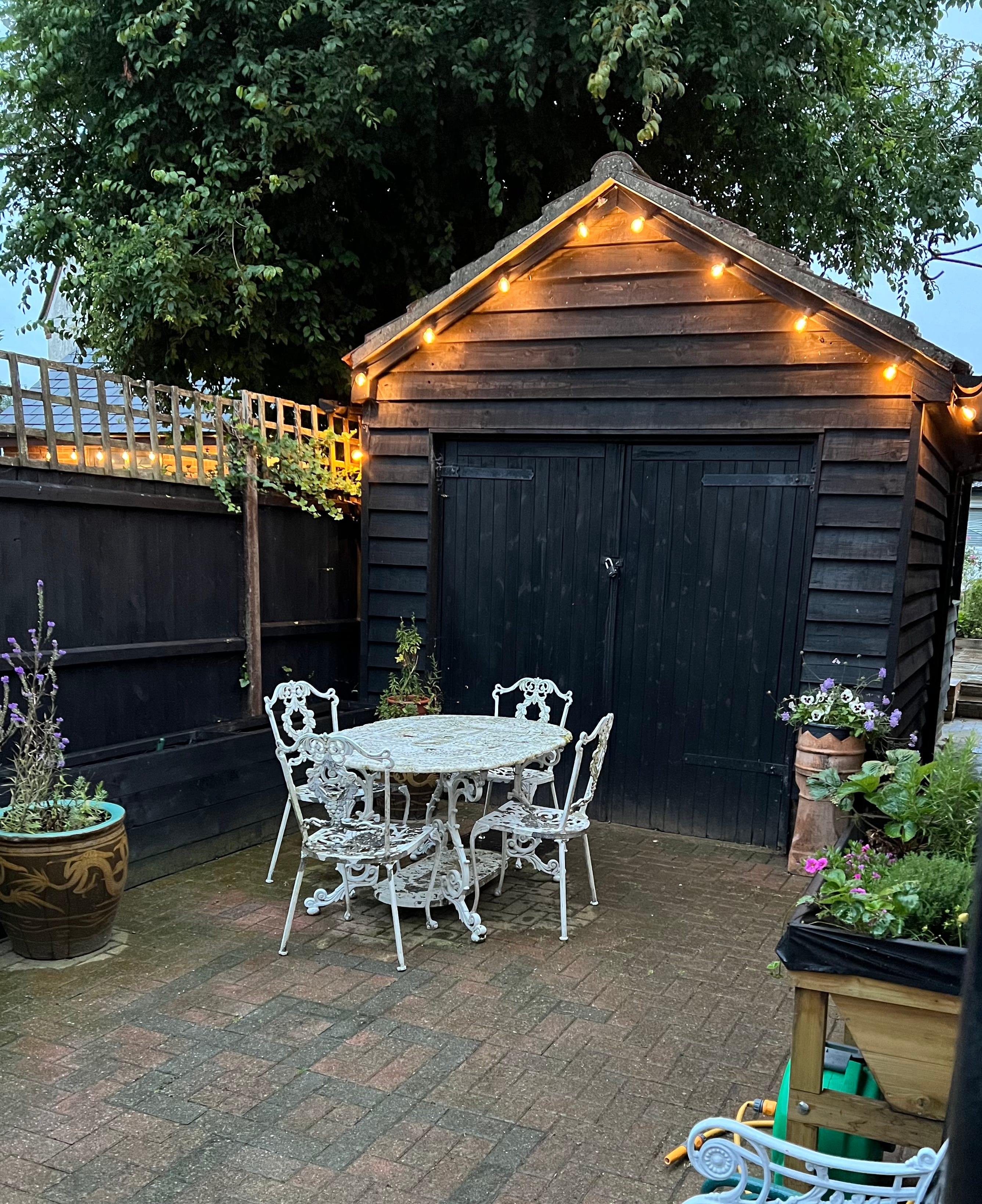 This whole area was looking a bit rough before I moved in with a broken meter box, rotten trellis and gates and lots of weeds and moss. Because it’s sheltered it is hard to keep moss free. The fence I painted is already cover in verdigris again. I want to replace the hanging basket brackets and garage door. My favourite bit is the festoon lights.