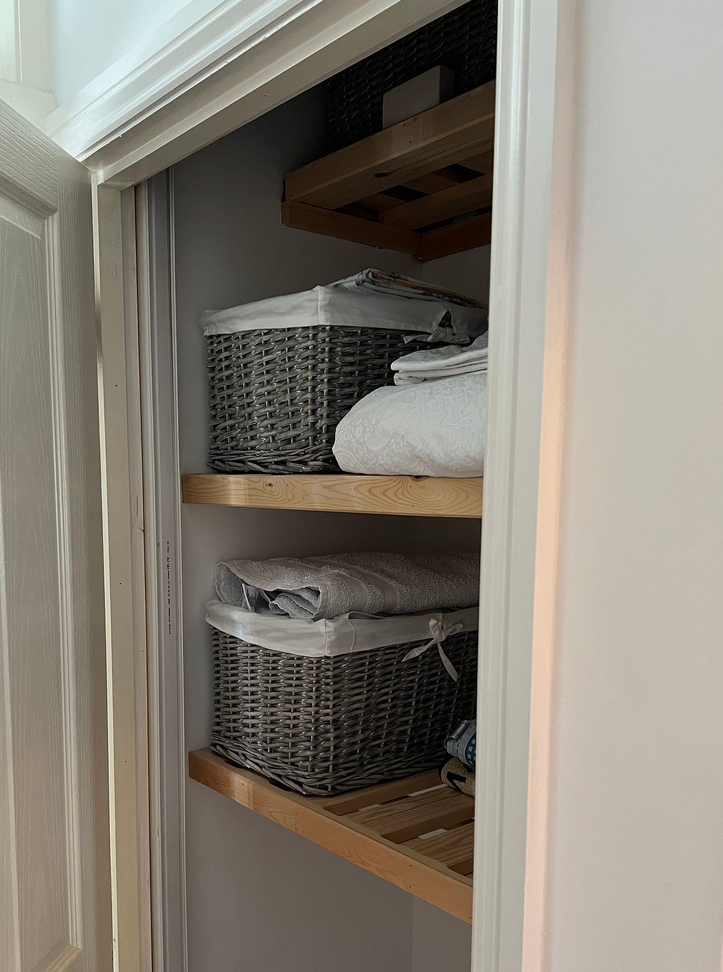 Overall I liked the decor chosen by the previous owners. I have done very little painting other than painting the new skirting, the stair treads, desk and the wooden floor in the study. It’s been more a matter of tidying up what they started. Removing paint from the glazing on the door to the stairs, filling in missing bricks in the chimney breasts, removing cable clips, stray wires and rusty hanging basket brackets. Whilst the walls has been skimmed in the main rooms on the house, their airing cupboard and under stairs cupboard sported 1930’s wallpaper and a large collection of holes where water tanks and boilers had previously been housed.